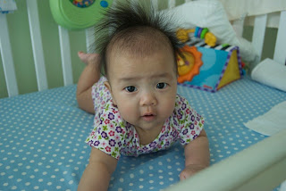 A lot of exciting happenings in the past two weeks leading up to Nisa's 4-month b-day. First, she can sit up in the Bumbo without leaning too much to one side. She can hold her head upright while on her stomach. And finally, she can flip over and back!
